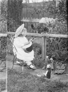 [Little girl sitting on chair in the garden, playing music to her dolls on ground in front of her, whole-length, to left.]