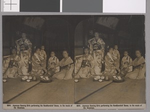 Japanese dancing girls performing the handkerchief dance, to the music of the Shamisen