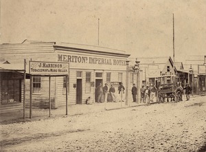 [Majorca streetscape showing J. Harrison tobacconist and music-seller, Meriton's Imperial Hotel and butcher's shop further down street]