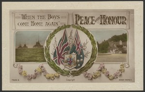 "When the boys come home again" - peace with honour [postcard, World War I]
