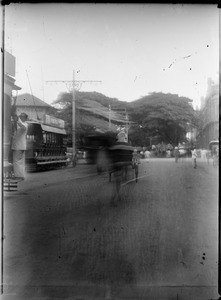 [Street in an unidentified town, possibly in Asia, showing electric tram advertising Lipton tea]