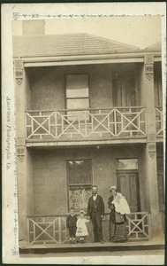 [Unidentified family standing in front of a double storey terrace house, Capel Street, West Melbourne]