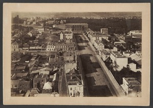 Looking East showing Collins Street, Russell Street, the Independent Church spire and Treasury Building.