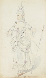 Female character from a Cinderella pantomime, whole-length, standing, to right, wearing a pale grey dress trimmed with violet flowers, holding a staff.