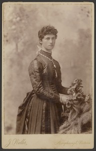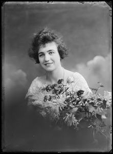 [Portrait of a woman, standing, holding flowers]