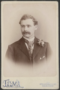 [Head and shoulders studio portrait of young man, to right, with moustache, curly hair and flowers on his left lapel]