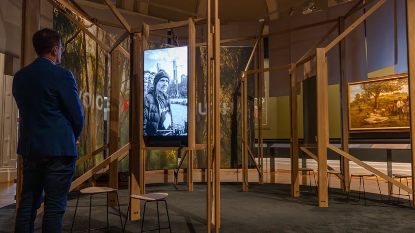 John Wesley Burtt’s painting of the signing of the Batman Treaty will also be on display as well as maps which detail the area that Batman intended to acquire. A central structure inspired by the majestic tree depicted in Burtt’s painting, serves as a space to watch and listen to members of Victoria’s Aboriginal community, who have shared their views on what treaty means for them. It also invites conversation from all who visit.